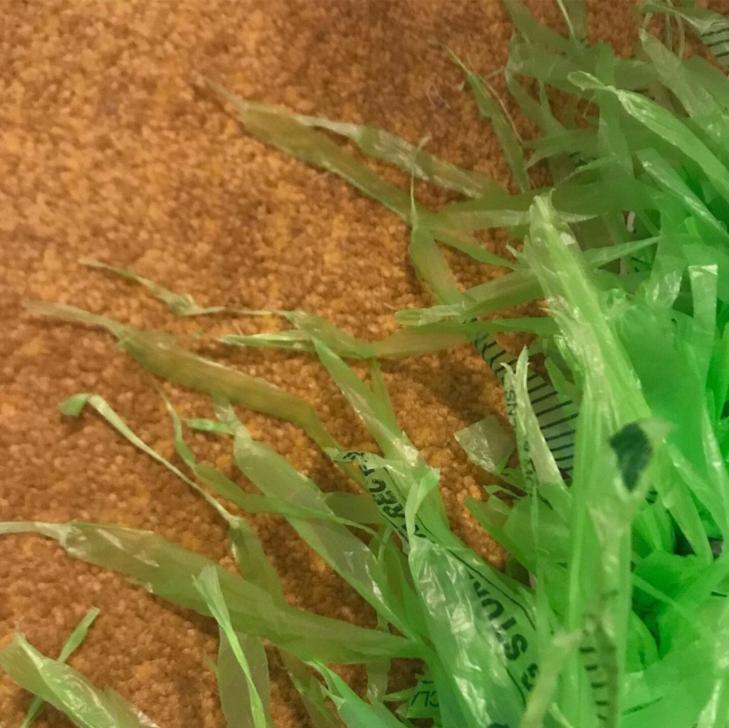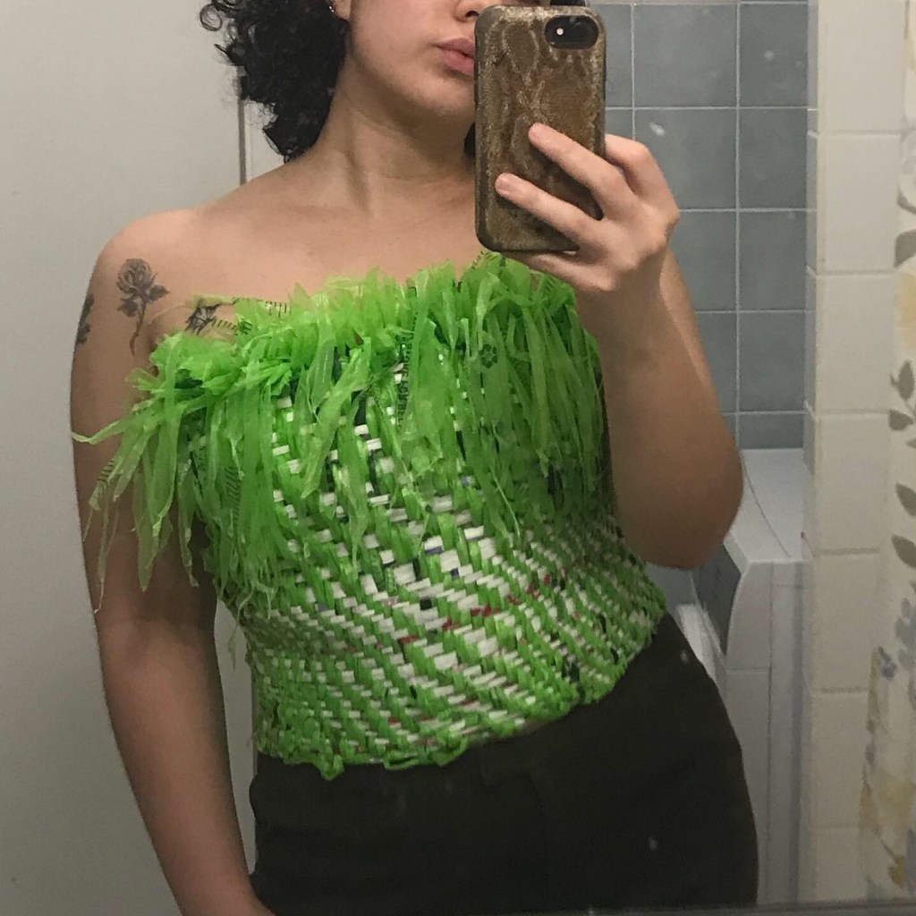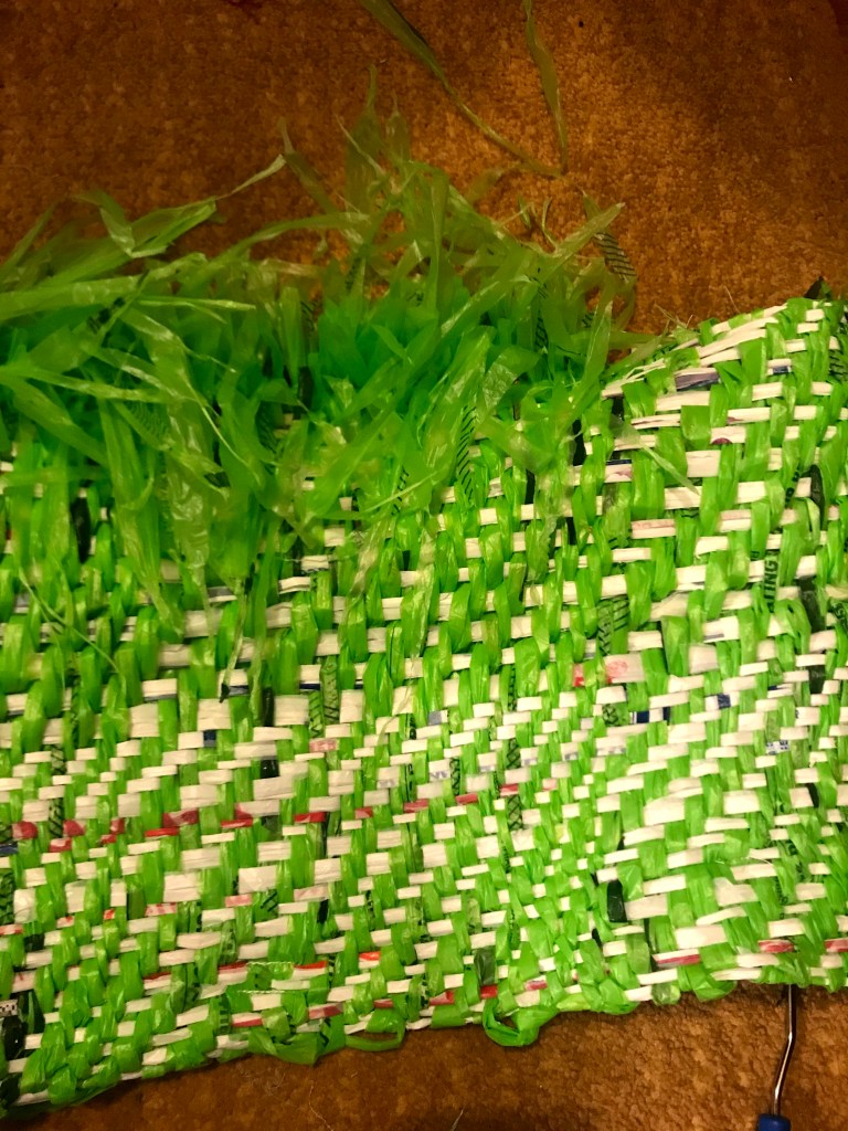 Plastic Experimentation Beads formed from found plastic Weaving with plastic bag warp and weft on four harness loom, 2019 and 2020