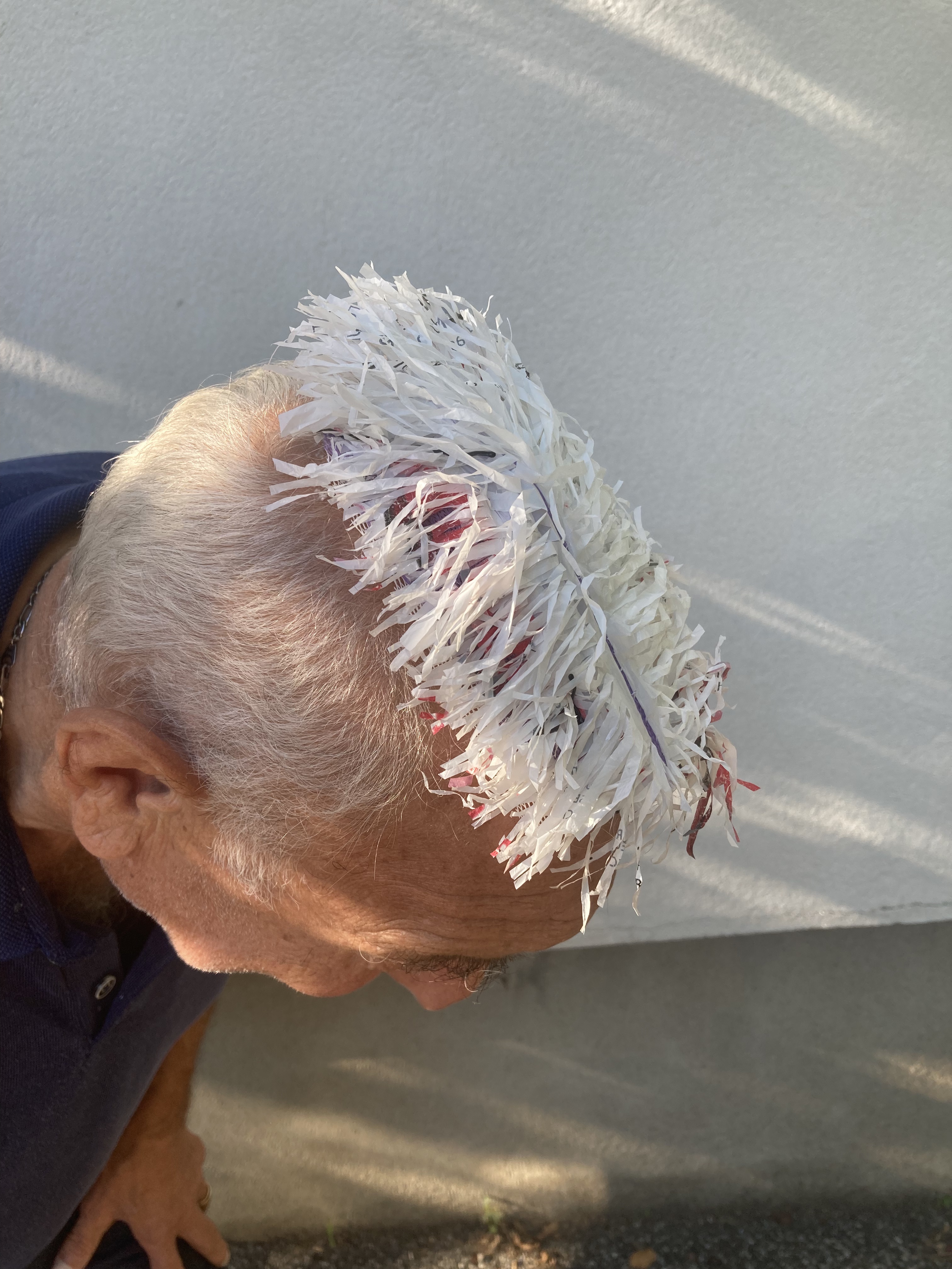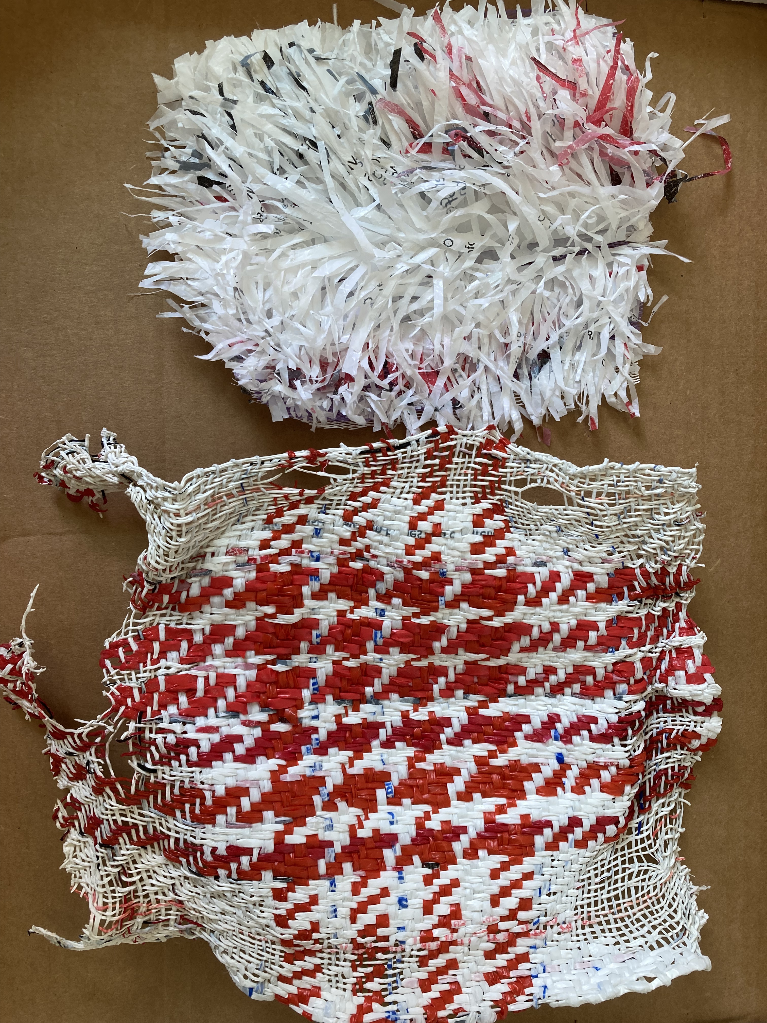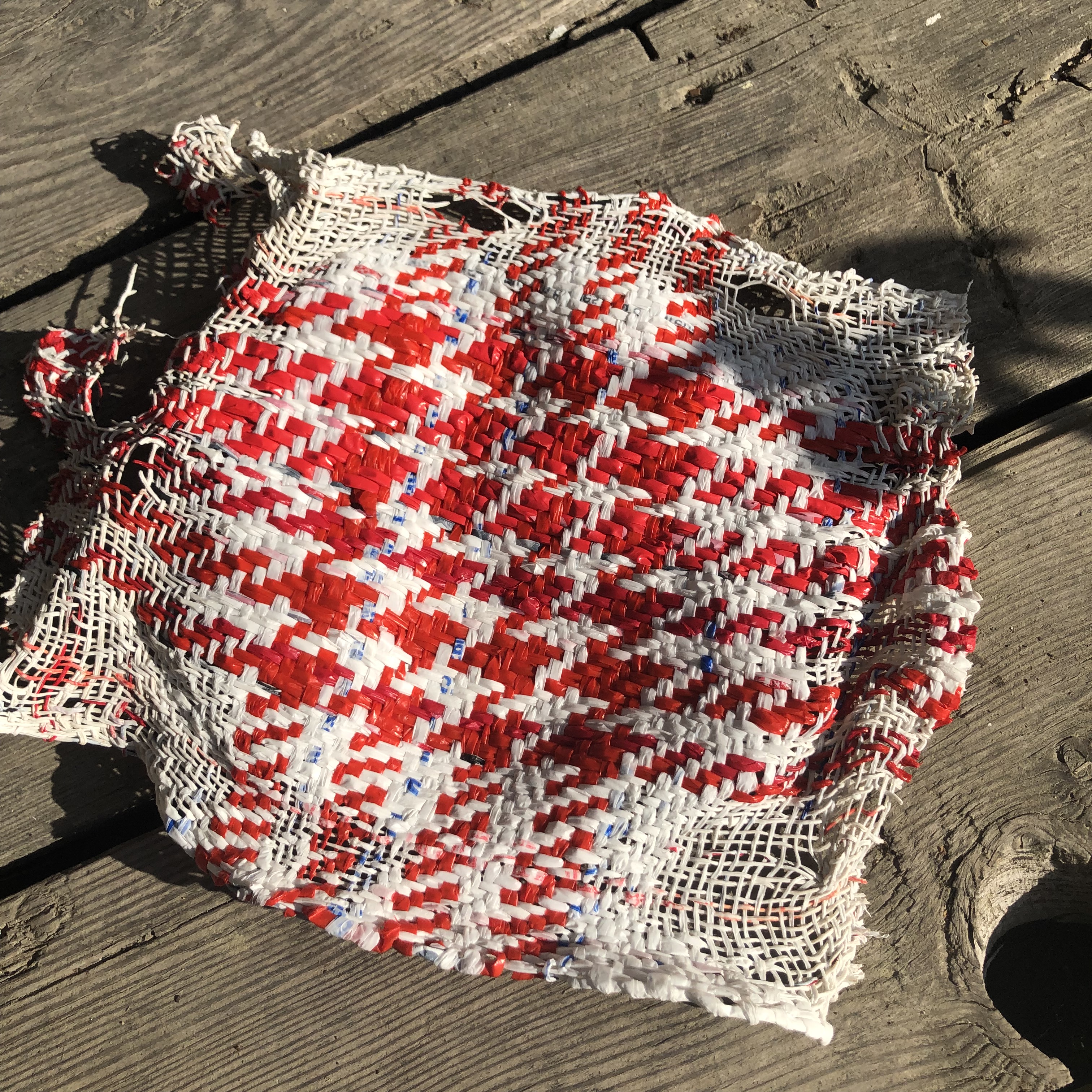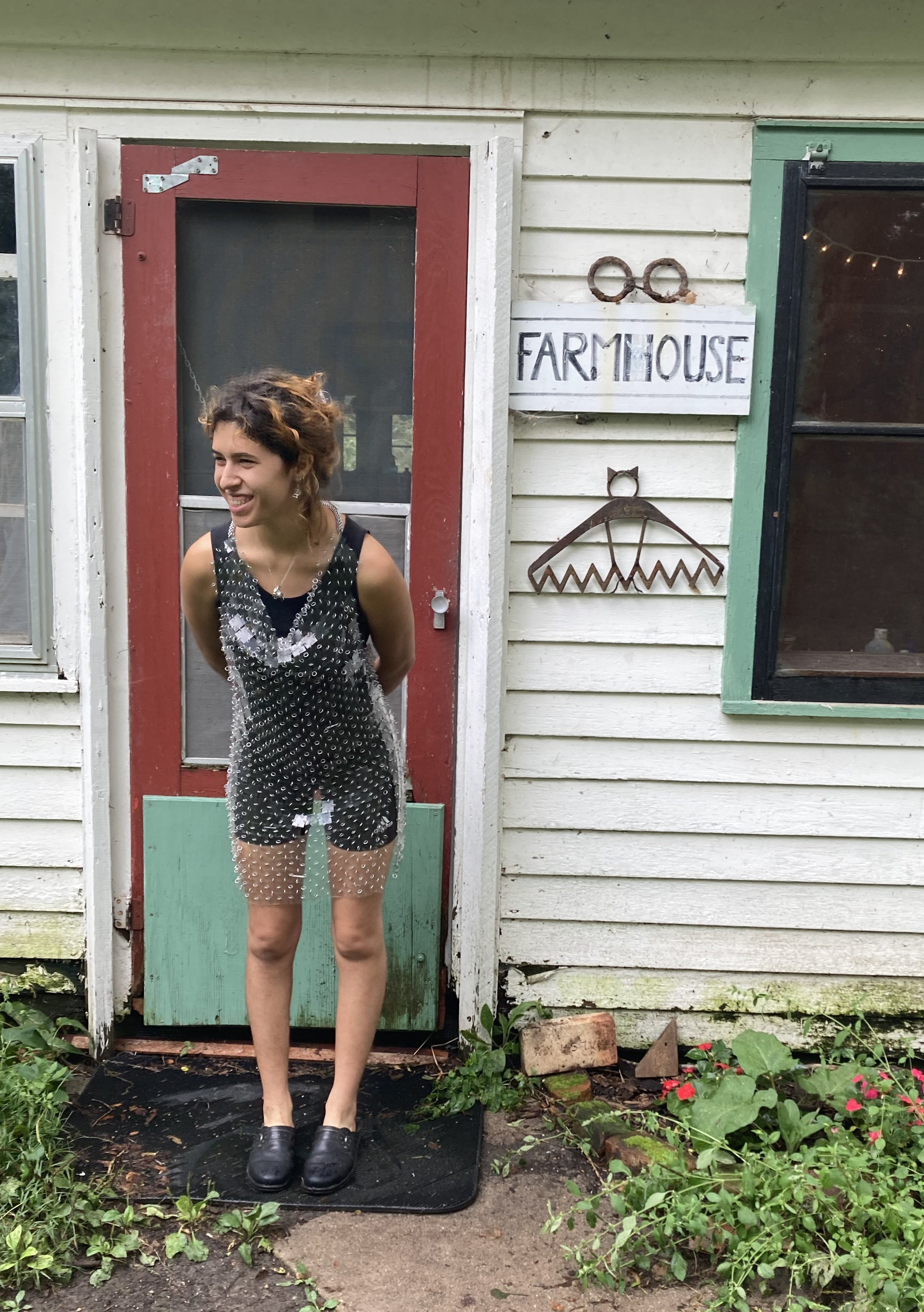 APOCALYPTIC FASHION INCLUDING DRESS MADE FROM PRODUCE CONTAINERS AND OTHER GARBAGE PLASTIC, PLASTIC BAG TOUPEE, SINGED PLASTIC BAG POCKET SQUARE, AND LEAF BRA. Created in collaboration with Olivia Gallo.