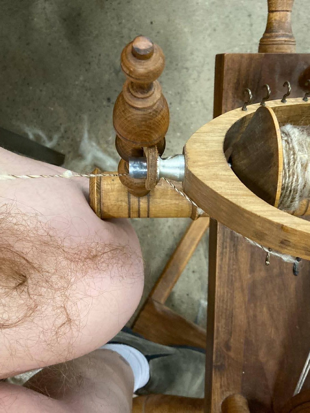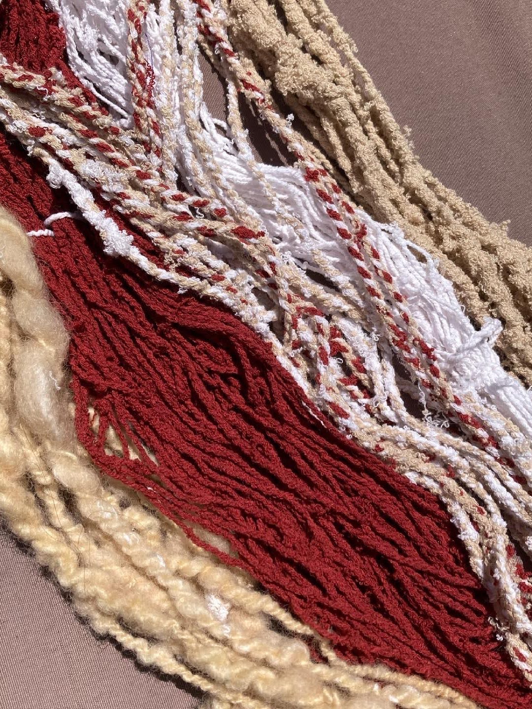 EXPERIMENTS IN SPINNING, WITH UNRAVELED COTTON T SHIRTS, PLASTIC BAGS CUT INTO STRIPS, OLD SEWING THREAD SCRAPS, AND MORE TRADITIONAL MATERIALS LIKE ALPACA WOOL
